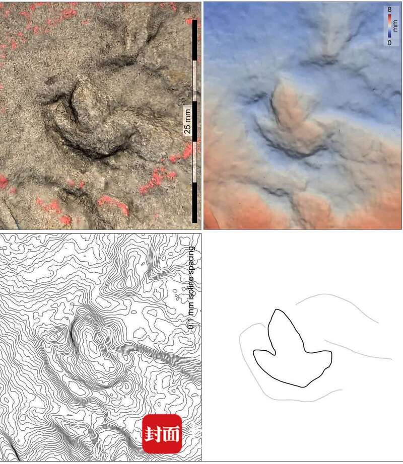 自贡恐龙博物馆本次征集的标本有八块足迹板,为了精确勾勒足迹的轮廓,课题组使用了三维图片重建,数据分析可视化,和三维点云处理软件制作了三维图片,在这个过程中,五号岩板上面一个非常微小的足迹引起了学者们的注意。