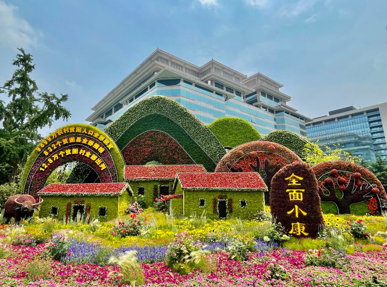 含义:花坛以十八洞村旧貌换新颜的幸福生活为场景,体现在迎来中国共产党成立一百周年的重要时刻,"全面建成小康社会取得伟大历史性成就,决战脱贫攻坚取得决定性胜利"。