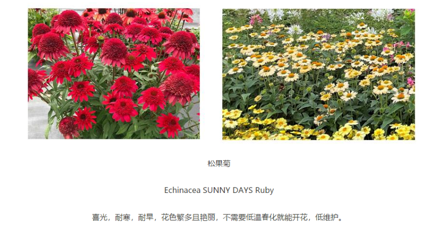 主景:花坛主景“1949”、礼花结构为多曲面立体结构,采用穴盘苗栽植工艺;花坛主景高大挺拔,地面混合花境,色彩丰富、层次分明、错落有致,大量应用观赏谷子、花烟草、松果菊等品种烘托主景。主打宿根花卉松果菊。
