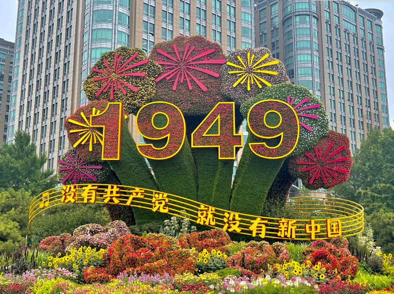 含义:花坛以“1949”、烟花为主景,配以《没有共产党就没有新中国》乐谱、簇拥的花朵等,体现在中国共产党的领导下,中国人民从此站起来的辉煌时刻。