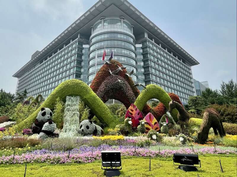 主景:花坛营建了一幅展开的山水美景画卷,用白色的马蹄金模拟山间瀑布景观,创新应用新开花穴盘苗:小矮牵牛、舞春花插植了两只花 “绵羊”,应用多彩矾根、各色长寿花,插植成彩色树木;点缀在山水间山脚下马匹体态壮硕好似白云的绵羊,慢慢游动于花间。三只憨态可掬的大熊猫悠闲地吃着青竹,营造了一幅自然和谐的生动景致。花坛主要应用山桃草、蓝羊茅、萱草、婆婆纳、钓钟柳、福禄考、金鸡菊等宿根花卉营造美丽的自然景观。