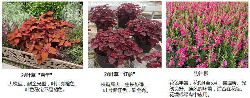 主景:红旗采用卡盆工艺,人物采用玻璃钢工艺结合穴盘苗插植工艺,展现出人们幸福安康的美好生活场景。花坛集中应用大量一、二年生花卉新品种:矮牵牛、美女樱、草海桐及宿根花卉新品种:滨菊、吊钟柳等品种;丰富的园艺品种呈现出园林园艺发展成果与人民共享的美好画面;主打宿根花卉钓钟柳。花坛中首次应用两个命名为“红船”和“百年”的彩叶草自育新品种,向党的百年华诞献礼。