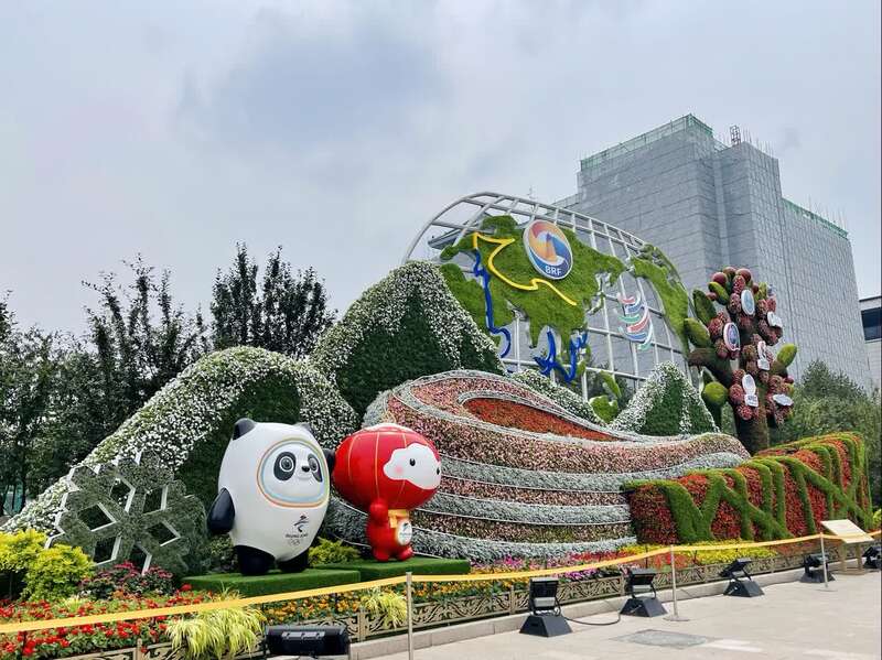 含义:花坛以鸟巢(2008年北京奥运会)、冰丝带(2022年北京冬奥会)、世界地图为主景,配以冬奥会吉祥物以及我国举办或参与的重大国际活动标识,体现在党的正确领导下,伟大的祖国阔步走向世界。