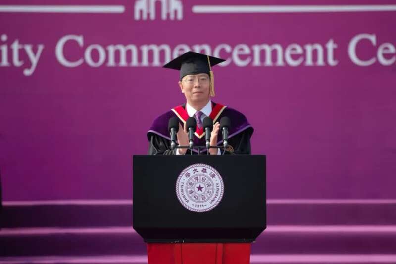 “从你们这一级开始,学校恢复了不会游泳不能毕业的老校规。经过大家的努力,在全体应测同学中,超过99%的同学通过了游泳测试,清澈的泳道见证了‘体魄与人格并重’的清华体育传统在你们身上的传承。今天,你们每一个人都戴上了绣着你们名字和学号的毕业纪念徽章,丝丝密密的金线承载着母校对你们无限的美好祝福。今天,你们每一个人都穿上了以紫色打底、以紫荆花丁香花装饰的新版学位服,同学们说这是学校给大家披上的“紫荆战袍”。此时此刻,身披战袍、意气风发的你们是清华园最美的风景,是敢于破壁、永远追光的最美少年!”邱勇说。