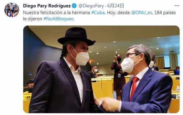 △迭戈·帕里在社交媒体上发布他与古巴外长罗德里格斯(右)在联大会议期间交谈的照片