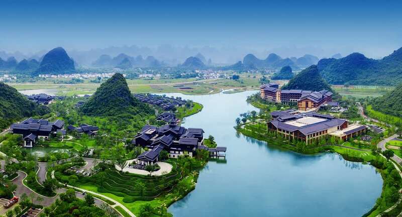 其次,“山水+酒店”模式更是深度挖掘桂林山水的休闲价值。无论是依山水而居的特色客栈、还是被35万㎡人工湖与湿地环绕的新侗瑶建筑风格度假酒店群,都将刷新桂林的旅宿体验。