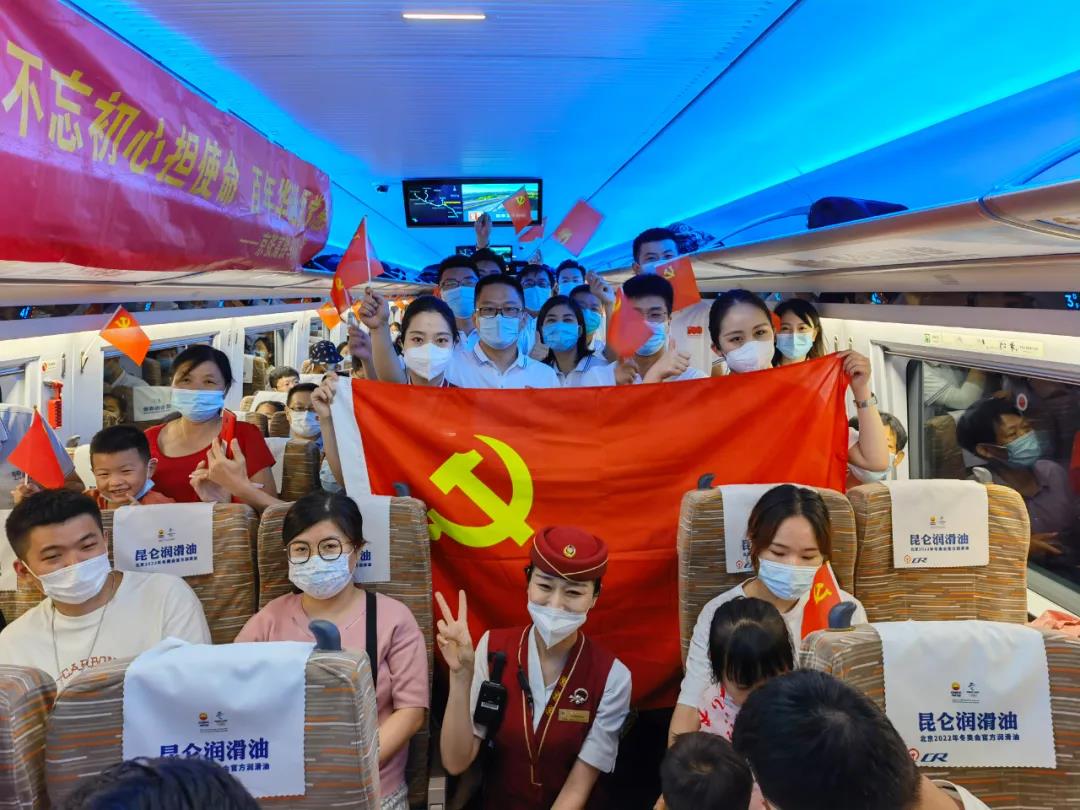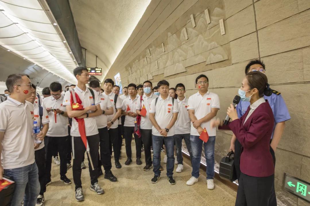 中国中铁作为京张高铁建设的主力军,负责京张高铁全线勘察设计任务,并承担了全线80%的建设任务,完成了包括官厅水库特大桥、八达岭长城站、太子城站等一大批控制性工程。团员青年们选择在清河站乘车,前往国内埋深最大、最复杂的暗挖洞群车站——八达岭长城站。途中,中国中铁的青年们和北京铁路局京张高铁车队高一组的乘务员联合开展红歌快闪,唱响《没有共产党就没有新中国》,吸引了在座乘客一同参与。