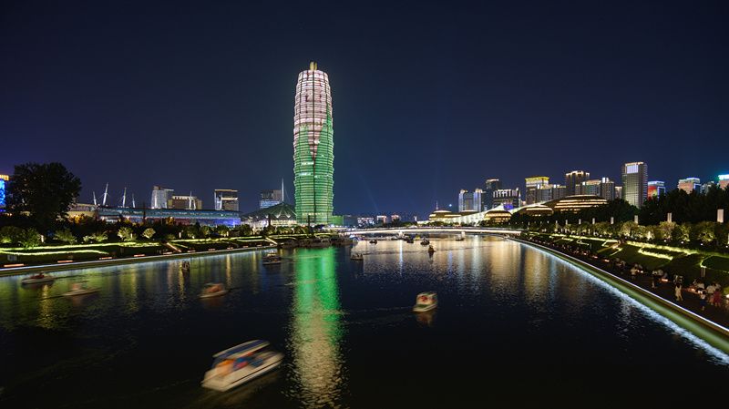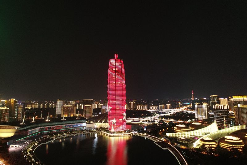 2021年6月27日,河南郑州在CBD千禧广场举行灯光秀表演庆祝中国共产党成立100周年。