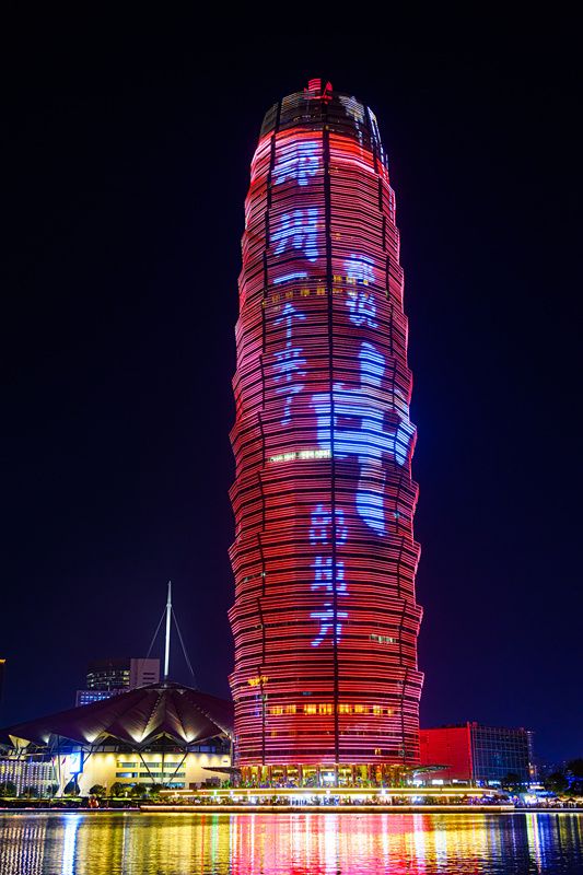 2021年6月27日晚,河南郑州CBD地标建筑“玉米楼”上演建党主题灯光秀。