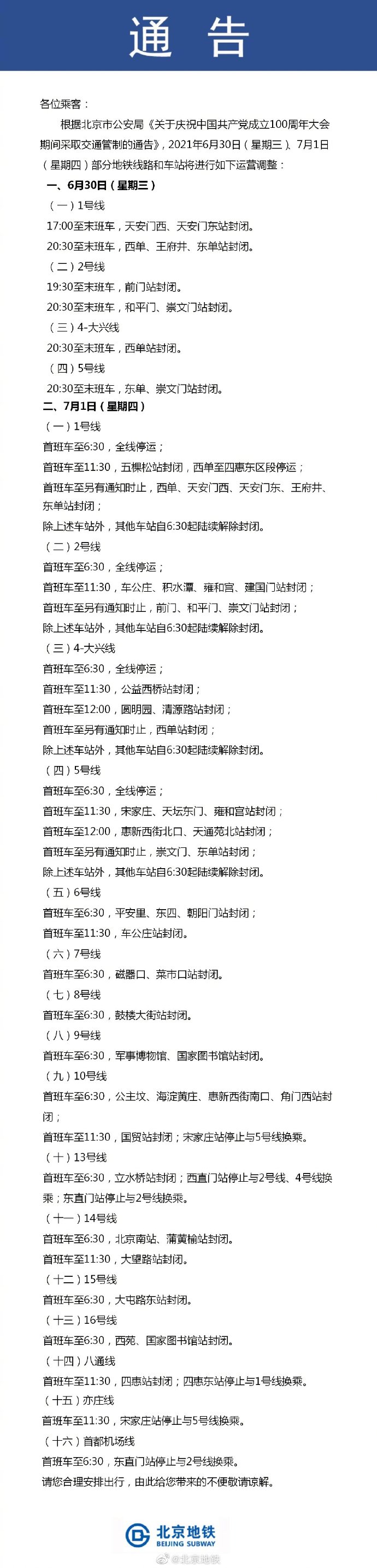 @北京地铁微博消息,根据北京市公安局《关于庆祝中国共产党成立100周年大会期间采取交通管制的通告》,2021年6月30日(星期三)、7月1日(星期四)部分地铁线路和车站将进行如下运营调整: