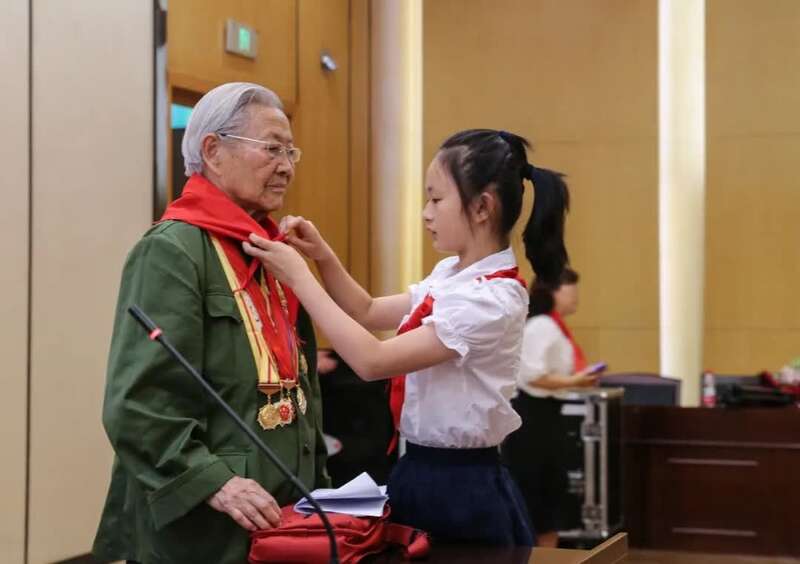 课程伊始,少先队员代表为李少英奶奶佩戴上鲜艳的红领巾。李少英1945年3月入伍,1947年11月加入中国共产党,如今已有74年党龄。她曾经参加过著名的孟良崮战役、淮海战役、渡江战役和抗美援朝战争,曾经荣立二等功两次、三等功四次,荣获解放奖章、独立功勋荣誉章、朝鲜民主主义人民共和国自由独立勋章。她以自己的亲身经历向少先队员们讲述了一个个鲜活的战斗经历,引导大家以英雄模范为榜样,继承革命传统,传承红色基因。