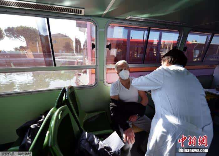 当地时间4月5日,意大利威尼斯,水上巴士在当天变为新冠疫苗接种站,为80岁以上的老年人接种新冠疫苗。