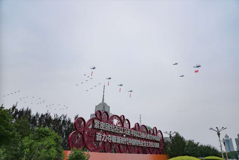 此次参演的空中梯队依次是空中护旗梯队、空中“数字”梯队、歼击机梯队和教练机梯队。其中,空中护旗梯队护卫党旗并挂装“伟大的中国共产党万岁”“伟大的中国人民万岁”“伟大的中华人民共和国万岁”“全国各族人民大团结万岁”庆祝标语,率先通过天安门广场,拉开飞行庆祝表演序幕。参演直升机所悬挂的标语字幅面积大、空中姿态稳定难,4机同步要求高,航空工业通过前期大量科研鉴定试飞工作,提前攻克难关,令参演装备能够以良好的操稳特性和飞行状态,带领空中梯队“米秒不差”飞越天安门广场。