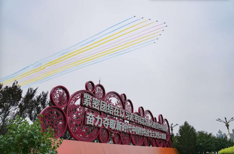 10架教8飞机组成的教练机梯队化作一道道彩带飞越天安门广场上空,寄寓着绚丽的天空、壮美的山河,将现场气氛推向高潮。教8飞机填补了国内通用型基础教练机的空白,可以满足我军新时期飞行训练需求。飞行学员在经过教8飞机训练后,再经过短期训练,就能驾驶航空兵主要作战机种,为实现航空兵训练体制改革作出重要贡献。
