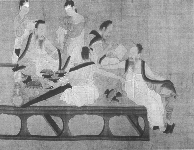 《北齐校书图》中的男人衣着:上身是心衣,下身是单袍