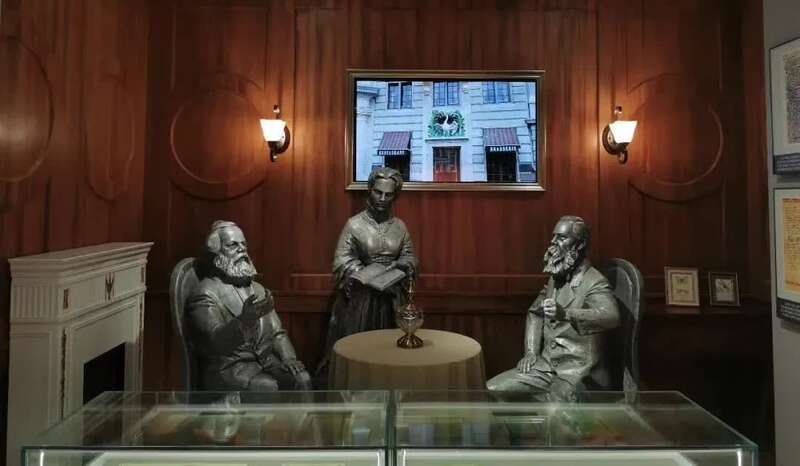在第二展厅,重点展示了比利时布鲁塞尔白天鹅咖啡馆内,马克思、恩格斯当年结下深厚友谊、联手研究写作《共产党宣言》的历史情境。在这里将特别提及马克思、恩格斯动笔写《共产党宣言》时的年龄,一个29岁,一个27岁,突显这部经典是无产阶级政党的青春宣言、成长宣言,字里行间洋溢着一个先进政党横空出世时的初心使命。