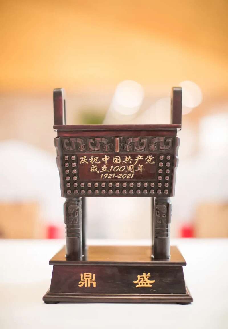 “这件‘四足冲耳方鼎’,是由紫铜和24k纯金,并配以红木底座等材料制作而成,是我们为庆祝中国共产党成立100周年专门设计制作的。”徐红军说。