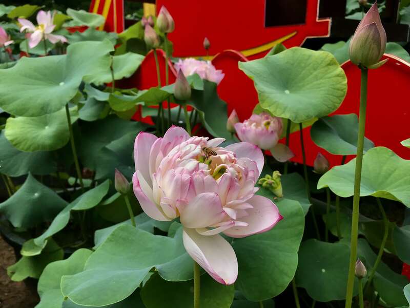 “婚恋+莲花”是本届莲花节的崭新打卡点。广州莲花山将品种名为白雪公主、婚纱、鸳鸯锦等各式莲花与十多组特色景墙有机结合,打造“心莲心”“幸福之门”等莲荷园景。