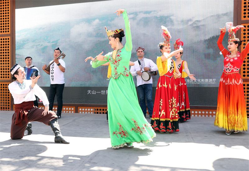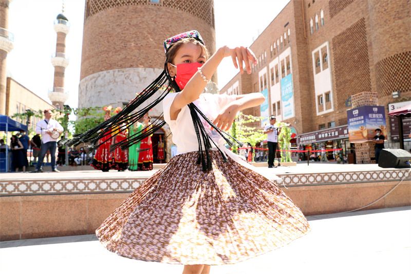 2021年7月3日,乌鲁木齐,演员在新疆国际大巴扎景区表演舞蹈。近日,该景区组织开展歌舞巡游活动,引来众多游客在这里观看歌舞表演、选购商品。