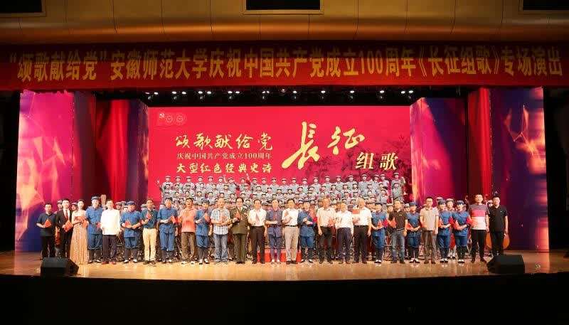 中国青年报客户端讯(中青报·中青网记者 王磊 王海涵)7月4日晚,安徽师范大学庆祝中国共产党成立100周年大型红色经典史诗《长征组歌》正式演出。该校音乐学院青年交响乐团、合唱团师生为主要参演人员,校音乐学院客座教授、原北京军区战友文工团常任指挥吴自强担任指挥,原战友文工团副团长、1965年《长征组歌》首演者马子跃进行朗诵解说。