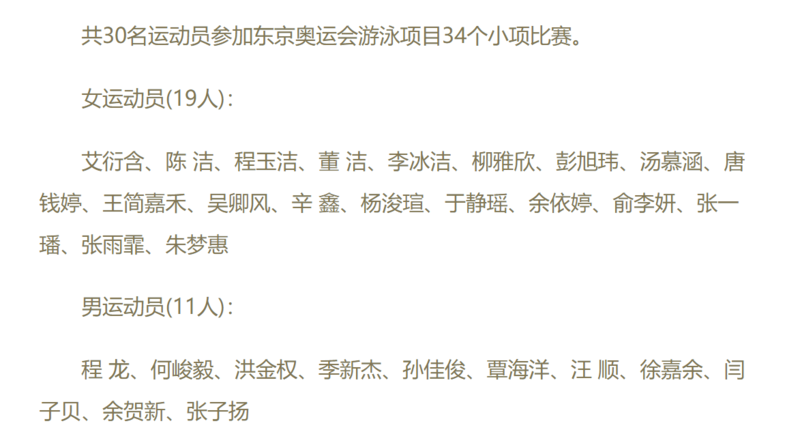 中国游泳队此次共有30名运动员参加东京奥运会,相比近几届奥运会中国游泳队的队伍规模,此次是运动员人数最少的一次。从中国运动队近一年来的成绩看,张雨霏的女子100米和200米蝶泳有望成为中国游泳队在东京奥运会上比较有希望的夺金点。