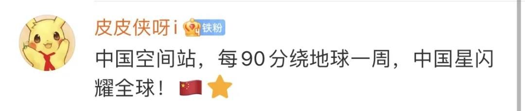 还有网友引用了奶茶经典台词的格式,写道“中国空间站,每90分钟绕地球一周,中国星闪耀全球!”↓