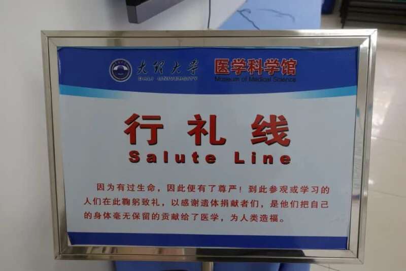△大理大学医学科学馆的“行礼线”指示牌上,写着“因为有过生命,因此便有了尊严!”