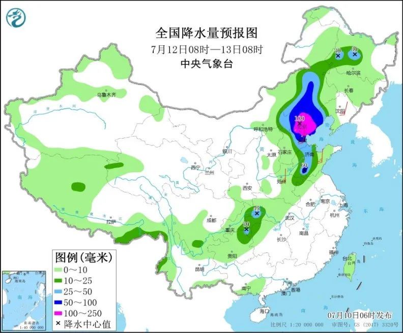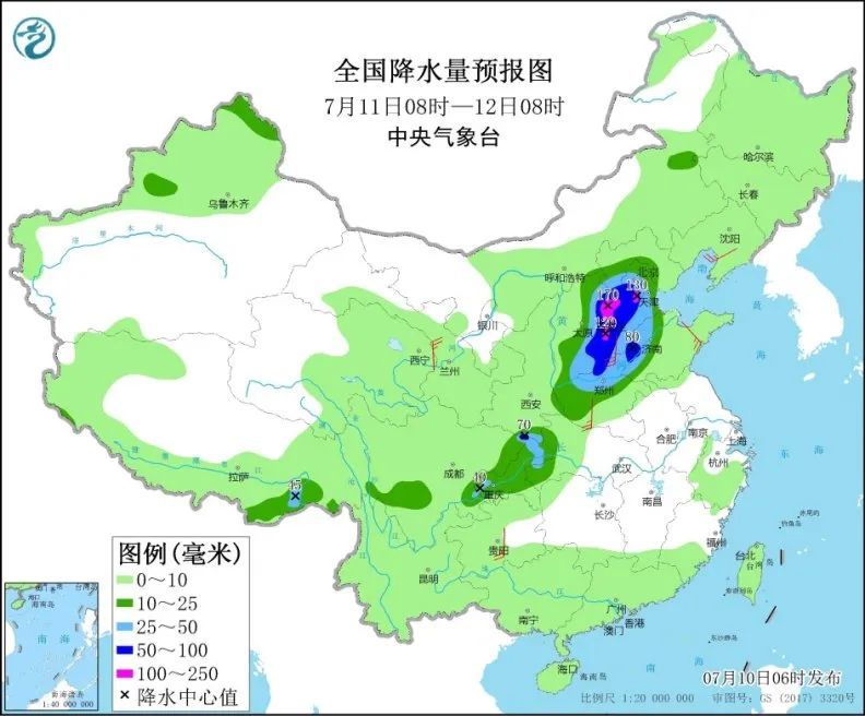 影响范围将覆盖我国华北大部地区,具体来看——7月11日至13日,山西东部和南部、京津冀地区、河南西部和北部、山东中西部以及内蒙古东北部等地将先后有大到暴雨。其中,河北中部和东北部、北京西部和北部、天津北部等局地有大暴雨。