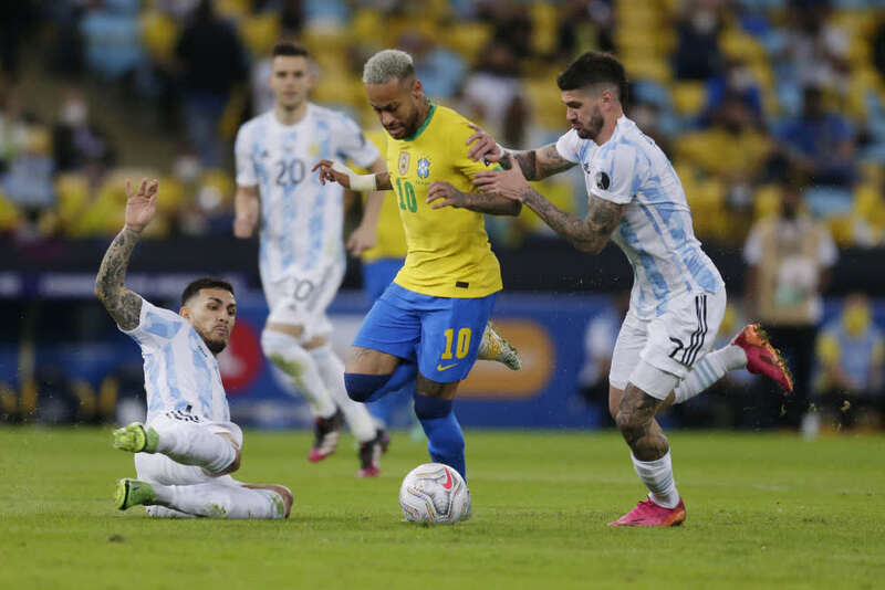 7月10日,巴西队球员内马尔(右二)与阿根廷队球员德保罗(右一)在比赛中拼抢。新华社发卢西奥·塔沃拉摄