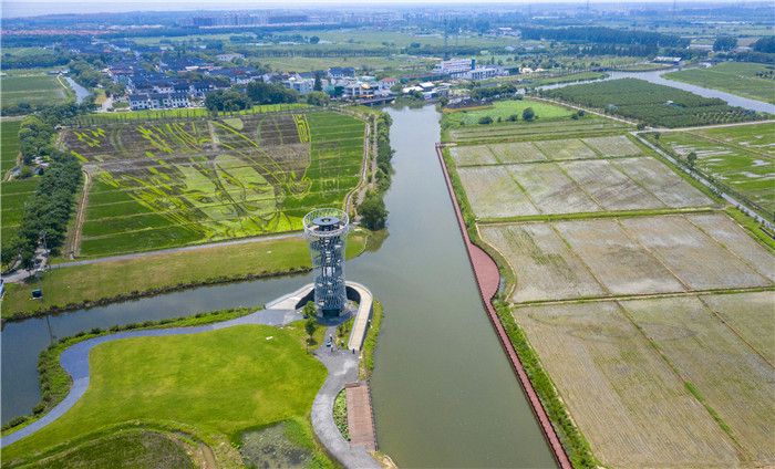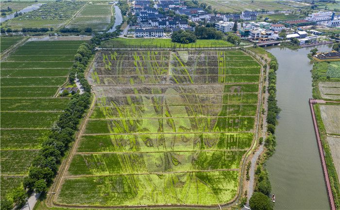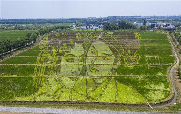 2021年7月10日,苏州,一幅以昆曲《牡丹亭》人物柳梦梅、杜丽娘脸谱为主题的“昆曲”稻田艺术画亮相昆山市张浦镇尚明甸村。