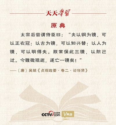 对于唐太宗的“镜子论”,白居易在《百炼镜》诗中赞曰:“太宗常以人为镜,鉴古鉴今不鉴容。四海安危居掌内,百王治乱悬心中。乃知天子别有镜,不是扬州百炼铜。”