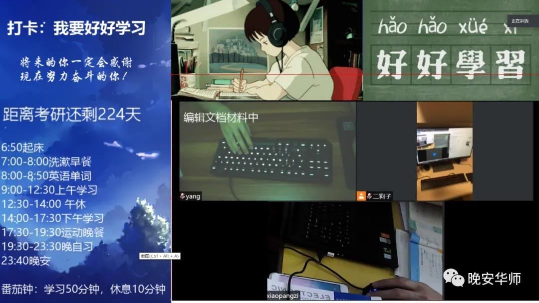 很快,宿舍四人想到了一个办法,“开直播连线,互相监督学习。”从四月份第一次打开视频连线开始,一直到开学,他们共同调整了一个作息时间,制定并分享了自己的复习计划,每天坚持在群里打卡复习进度,通过线上的联系互相鼓励、互相监督。正是因为有了彼此的陪伴,疫情期间独自在家的孤独、复习过程中的苦闷、容易懈怠的情绪都逐渐被消减,取而代之的是收获知识的自豪感、坚持打卡的成就感和对宿舍感情不断升温的愉悦感。