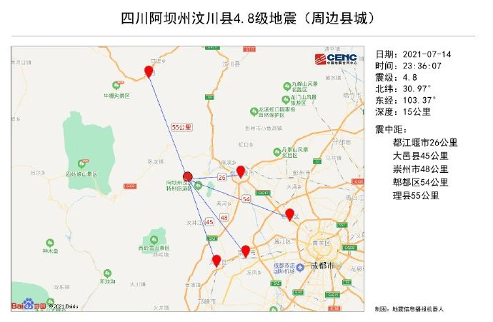 震中距都江堰市26公里、距崇州市48公里、距成都市76公里。