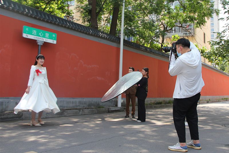 2021年7月15日,一对情侣在“连心里”路牌下拍照。河南郑州“连心里”被网友称为“最浪漫”的小巷,吸引众多年轻人、情侣前来拍照。 中新社发 李明明 摄