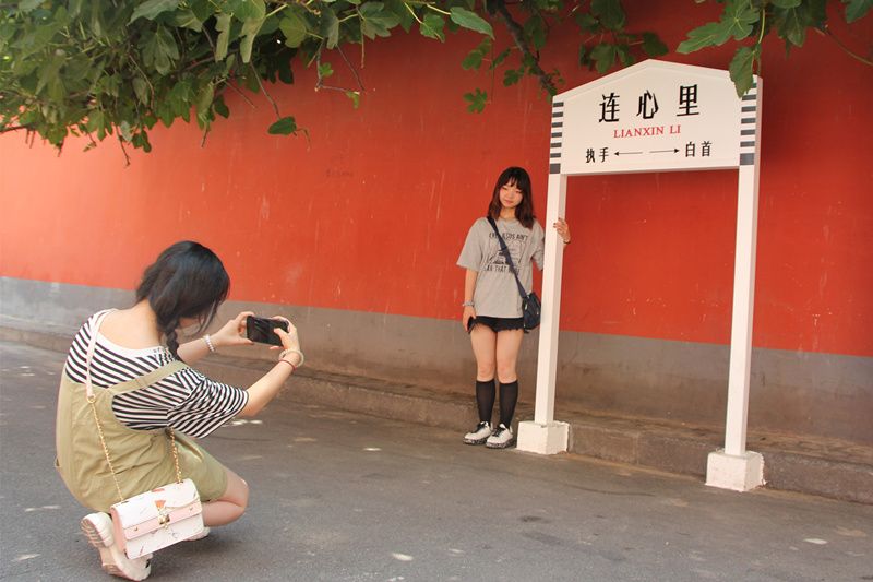 2021年7月15日,一名女子在“连心里”路牌下拍照。河南郑州“连心里”被网友称为“最浪漫”的小巷,吸引众多年轻人、情侣前来拍照。 中新社发 李明明 摄