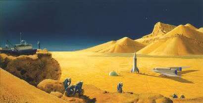 两位“领路人”为博尼斯戴尔的创作打下了科学描述语境下的现实主义风格烙印,其画作对于透视、投影、光暗有着近乎苛刻的要求,于不同场景中赋予不同天体迥异的天空与地质颜色、逼真到极致的视觉特点,处处在寻求一种合理的科学解释。但这种现实主义又矛盾地蕴含着最强烈的后现代元素,因为人类开始频繁出现在太空图景中。要知道博氏1888年生人,直至其15岁那年,莱特兄弟的“飞行者1号”才腾空而起,人类1961年才首次进入太空。今天再次回顾《准备返航的飞船》《降落月面》《探索火星》等一系列作品时,看到各类航空器或宁静肃穆或火焰喷薄地出现在宇宙的各个角度,不由赞叹博氏作品可谓跨世纪的科学预言。