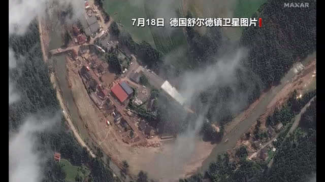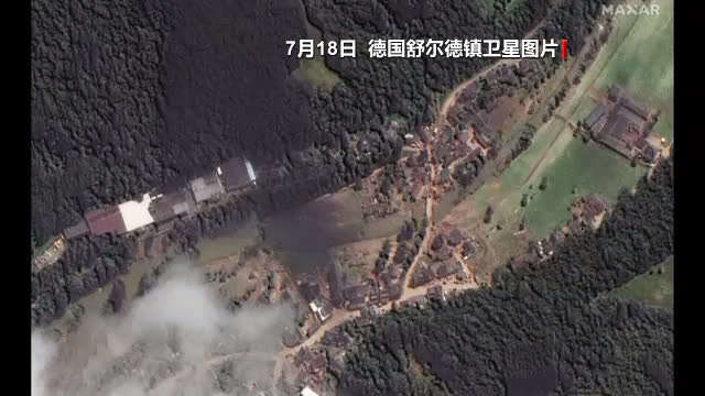 △18日小镇被洪水淹没后的卫星图片,这座位于阿尔河畔的小镇上大批建筑被洪水冲垮