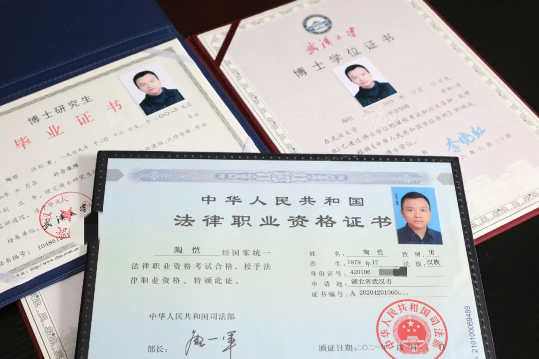 陶恺的博士毕业证、学位证和法律职业资格证书。