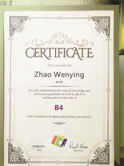 终于,赵文英顺利通过了B4段考核,成功刷新了全世界魔方B段年龄最大纪录——这是她2020年立下的目标,在2021年初顺利达成,接下来的目标是B1段的认证考核。