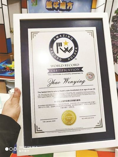 这不是她第一次刷新世界纪录了,2019年12月,赵文英就盲拧首次挑战WRCA世界纪录认证,结果以3分33秒挑战成功,成为全球60岁以上盲拧最快纪录者。