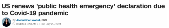 由于新冠病毒德尔塔变异株加速蔓延和疫苗接种推进受阻导致多地疫情反弹,美国卫生与公众服务部日前宣布自当地时间20日起,将去年1月以来美国一直在实施的“公共卫生紧急状态”再次延长90天。