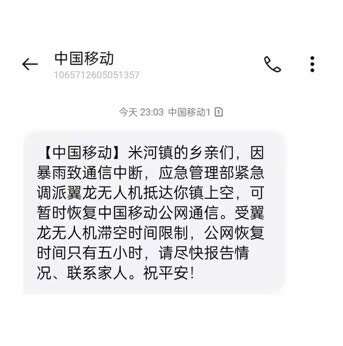 当地移动用户通过空中基站接收到的短信。中航(成都)无人机系统股份有限公司供图