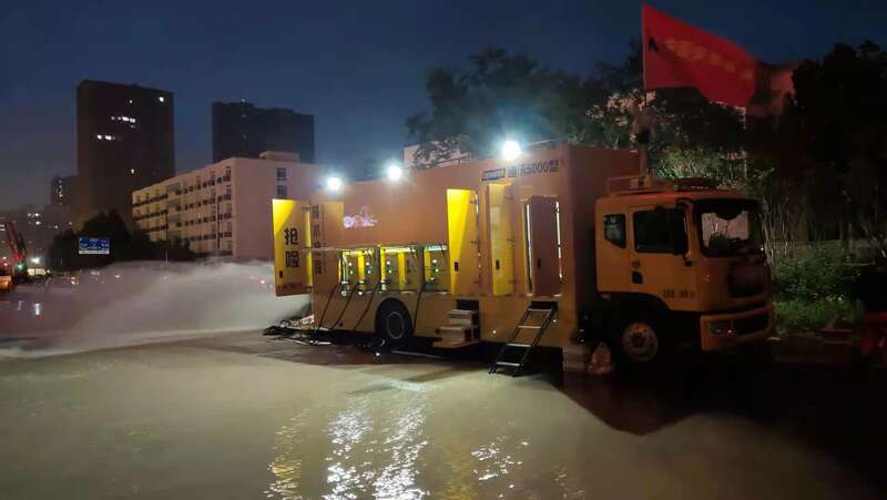 其中,京广北路隧道1台1500型,京广中路隧道1台5000型“龙吸水”排涝装备,京广南路隧道4台3000型远程控制子母式“龙吸水”,京广路隧道积水较重,隧道全长约4.9公里。现场时有急雨,队员们不顾风吹雨打、天气湿冷,通力协作,及时调整排水管和水泵位置、补充油料、加强巡视,确保排涝工作有序进行。截至22日19时,各任务点累计抽排40万方,隧道积水水位下降近2米,洪涝险情得到有效控制。
