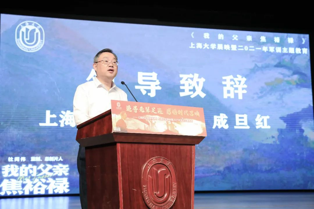 上海大学校友会理事、著名影视制作人、电影《我的父亲焦裕禄》监制杜闻伟,上海大学校友会理事、上海明基文化总经理陈挺,校领导成旦红、聂清,军训师师长、武警上海市总队执勤第五支队副支队长金观章,相关部处和学院领导以及上海大学军训师师团干部、参训学员代表出席展映式。