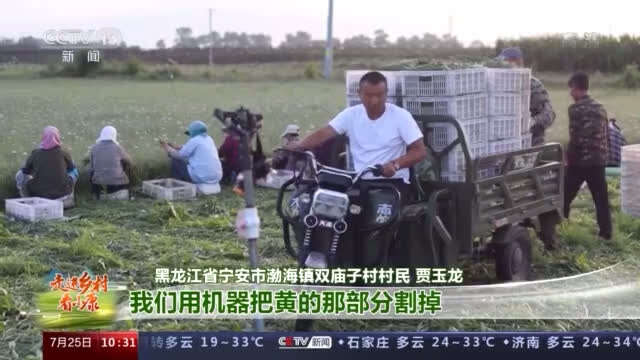 黑龙江省宁安市渤海镇双庙子村村民 贾玉龙:对于我们割韭菜来说也有很大的门道,割完这茬再割二茬,割完二茬之后就不需要再割了。就让它正常生长一夏天,到秋天它逐渐就变黄了,我们用机器把黄的那部分割掉,然后扣(大)棚,我们没有闲着的时候。