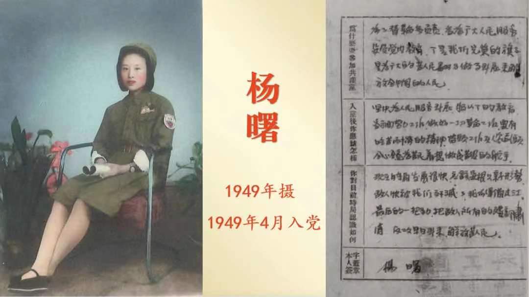 1949年4月,杨曙加入中国共产党。“我入党是为了替革命多负责,多为广大人民服务,接受党内教育……”她在入党申请书里写下庄严承诺。之后她跟随部队参加渡江战役,“我们要铆足最后一把劲,把敌人的残部肃清,解放受苦人民”。