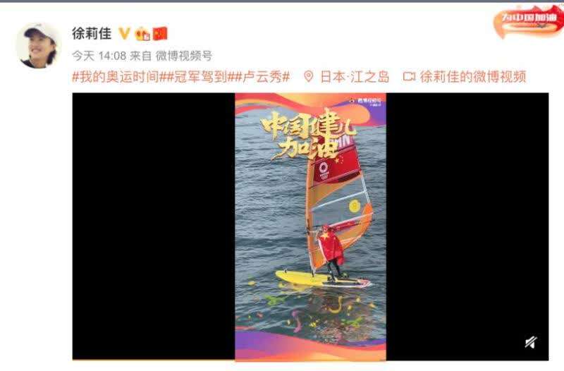 卢云秀女子帆板夺金后,奥运冠军@徐莉佳 在微博分享了一段视频,画面中,卢云秀披着国旗划帆板庆祝。