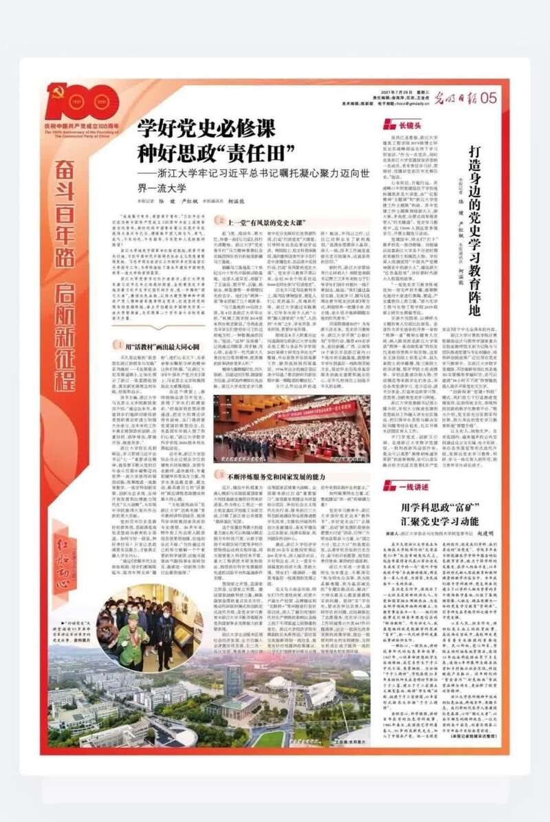 今天出版的《光明日报》“红船初心”特刊,推出《学好党史必修课 种好思政“责任田”——浙江大学牢记习近平总书记嘱托凝心聚力迈向世界一流大学》《打造身边的党史学习教育阵地》《用学科思政“富矿”汇聚党史学习动能》三篇文章,深度聚焦浙江大学不忘初心、牢记使命,求是创新、勇攀高峰,坚定迈向世界一流大学的生动实践。一起来看!