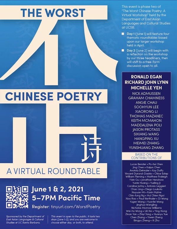 这个活动分为三个部分:在2021年四月,我们举行了一系列小型研讨会;2021年6月进行对公众开放的在线圆桌会议;我们最终的目标是出版一本学术专著——《最糟糕的中文诗歌:一部评论性选集》。