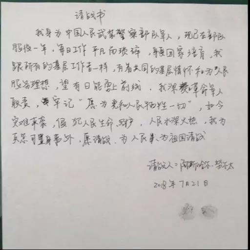 在部队的淬炼让阿斯哈尔从一名大学生蜕变成一名真正的战士,也更加坚定了他加入党组织的想法。2018年5月4日,阿斯哈尔正式向队里递交了入党申请书:“选择在部队入党,选择五四青年节这天申请入党,对我来说都是特殊的仪式感。”